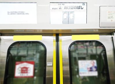 都営 全線(浅草線・三田線・新宿線・大江戸線) の乗降ドア上部に2枚1組(左右対)ステッカーを掲載する広告商品です。掲載は1ヶ月間。1車両につき1組(2枚対)を掲載します。