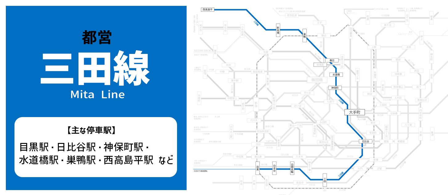 目黒駅・三田駅・日比谷駅・神保町駅・水道橋駅・巣鴨駅・西高島平駅 など