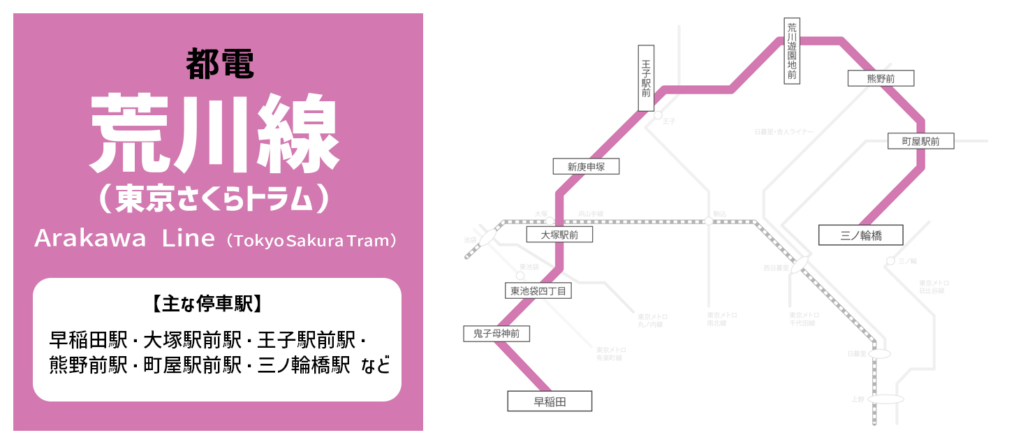 早稲田駅・大塚駅前駅・王子駅前駅・熊野前駅・町屋駅前駅・三ノ輪橋駅 など