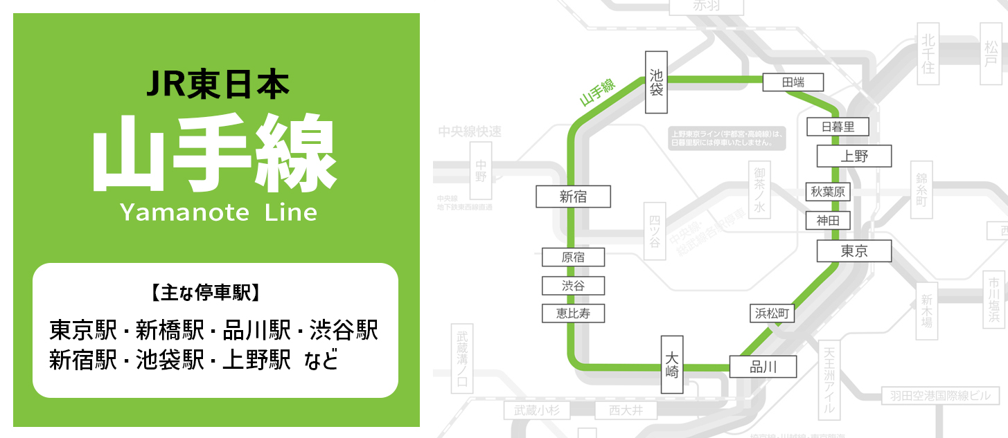 多くの駅がJR以外にも私鉄各線・地下鉄各線にも接続しており、主に東京都心部の主要エリアを走行しています。全国で「1日の乗降人数が最も多い路線」を誇っており、広告訴求力が抜群に高い人気の路線です。