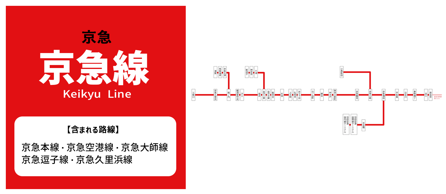 計5路線(京急本線・京急空港線・京急大師線・京急逗子線・京急久里浜線)を含む総称となっています。また泉岳寺駅からは都営浅草線への相互乗り入れ運行、押上駅からは京成線・北総線への相互乗り入れ運行も実施しています。
